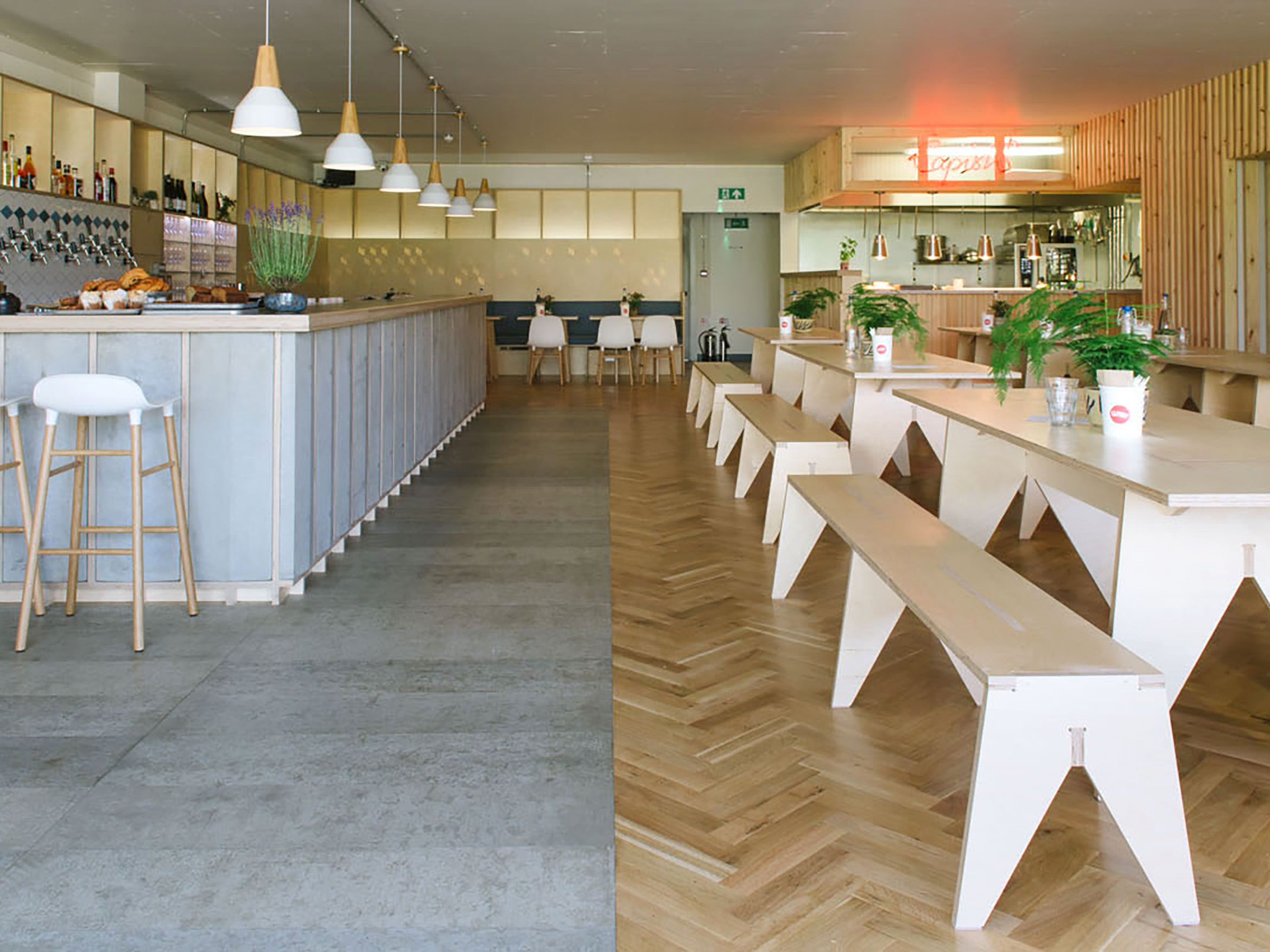Fleet designed bespoke furniture for the space, using the same manufacturing system to create the fixed banquette seating as the tables, benches and stools which slotted together from routed birch ply. The consistency of material helps to keep the space clean and uncluttered.